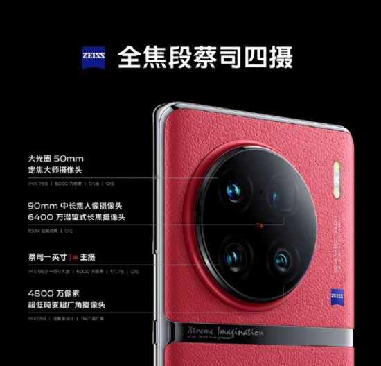 镜头部分,X90 Pro+搭载了全焦段蔡司四摄,并重点强化了长焦拍摄能力,分别由5000万像素蔡司T*广角主摄(1英寸大底索尼989传感器,23mm焦段)+4800万像素超低畸变超广角(索尼IMX598, 14mm焦段)+5000万像素人像中焦镜头(索尼IMX758,50mm焦段)+6400万像素潜望长焦镜头(OV64B, 90mm焦段)组成。