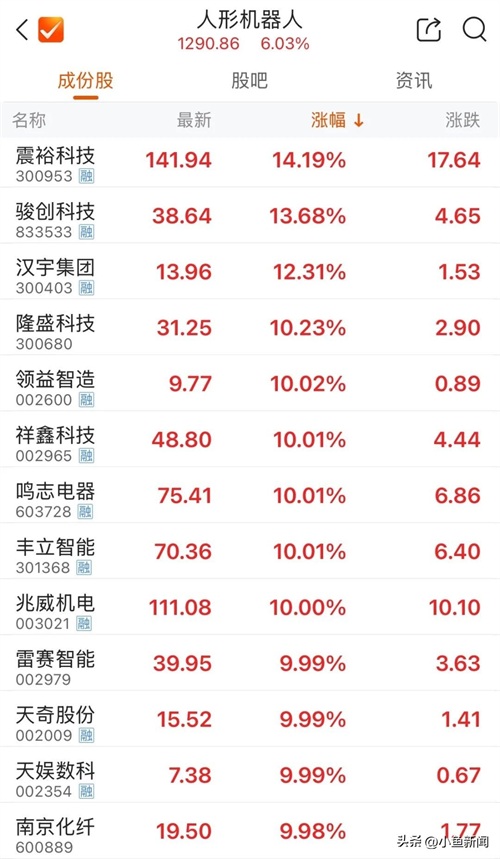 今日盘初,人形机器人概念股再度表现活跃。截至午间收盘,震裕科技、骏创科技、汉宇集团涨超10%,领益智造、鸣志电器、丰立智能、兆威机电等多股涨停。