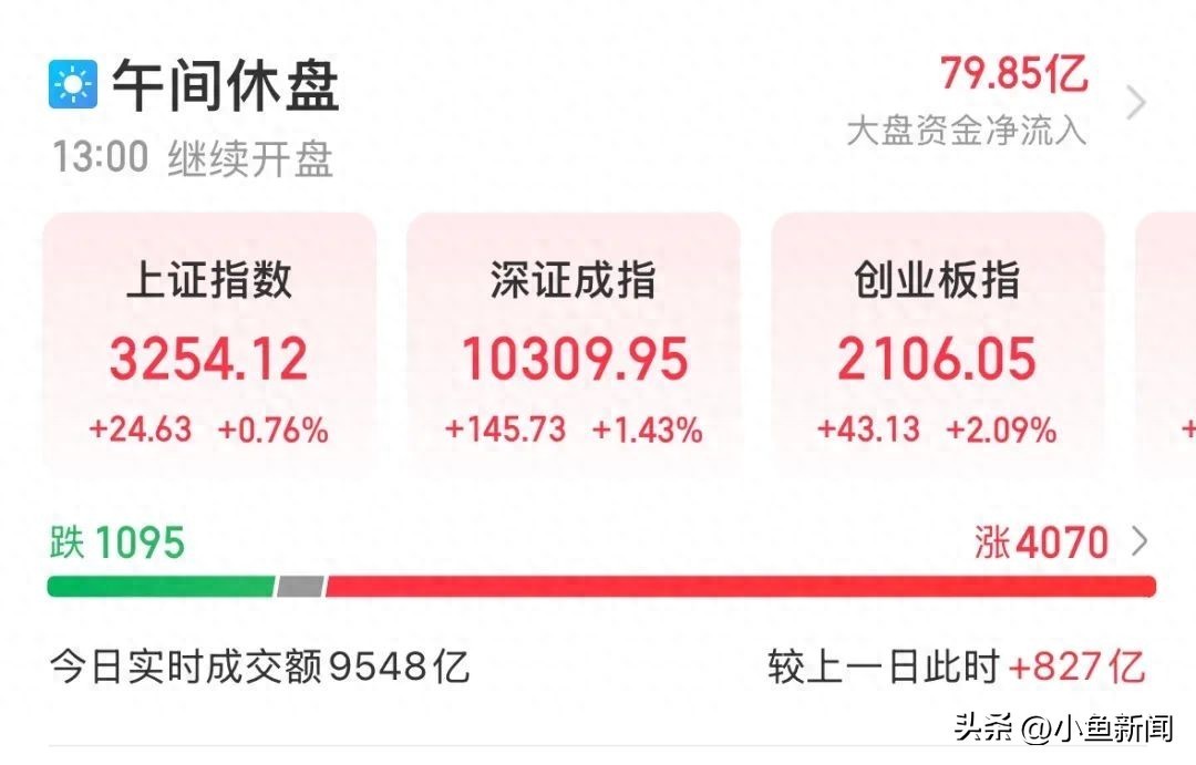 周四早盘,A股市场震荡走强,约10:30左右,三大指数开启一波拉升,创业板指一度大涨近3%。截至午间收盘,上证指数涨0.76%,深证成指涨1.43%,创业板指涨2.09%。A股市场半日成交额9548亿元,较上个交易日同期放量827亿元。