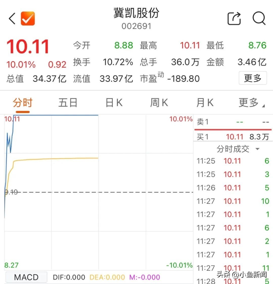 高位人气股冀凯股份今日开盘迅速封板涨停,走出12天10板行情。截至午间收盘,冀凯股份报10.11元/股,成交额3.46亿元。自1月14日以来,该公司股价已累计上涨116.03%。
