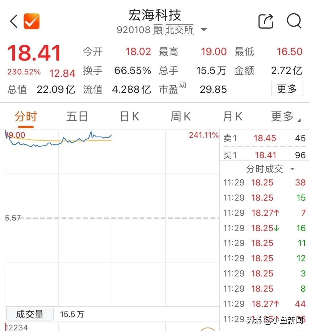 个股方面,N宏海今日正式登陆北交所,也是蛇年首只上市新股。截至午间收盘,N宏海报18.41元/股,涨230.52%,换手率66.55%,成交额2.72亿元。