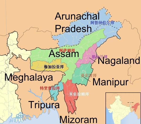 印度东北地区民族成分复杂,且局势非常不稳定,为了抑制这里的分离主义,当年印度就把这里划拉成了7个邦,设邦的密度远比印度本土大的多。
