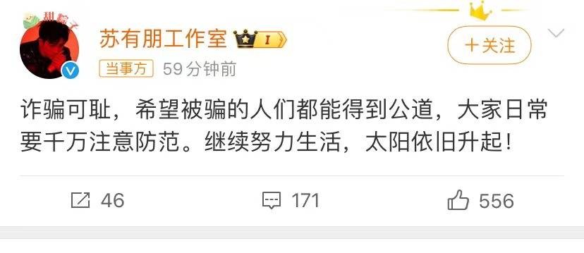 有网友报道,著名艺人苏有朋被卷入了一场金融诈骗案,成为了受害者。这一事件迅速登上了热搜,引起了广大网友的关注。苏有朋的工作室迅速给出了回应;诈骗可耻,希望被骗的人们都能得到公道,大家日常千万注意防范。继续努力生活,太阳依旧升起。表达了对于此次事件的重视。