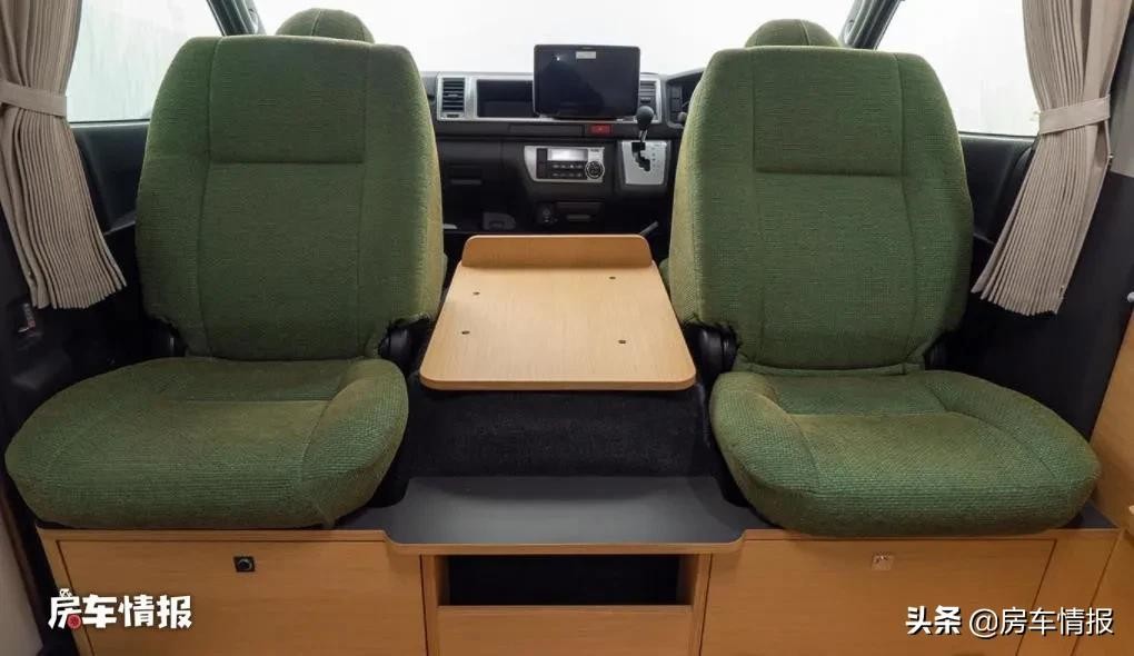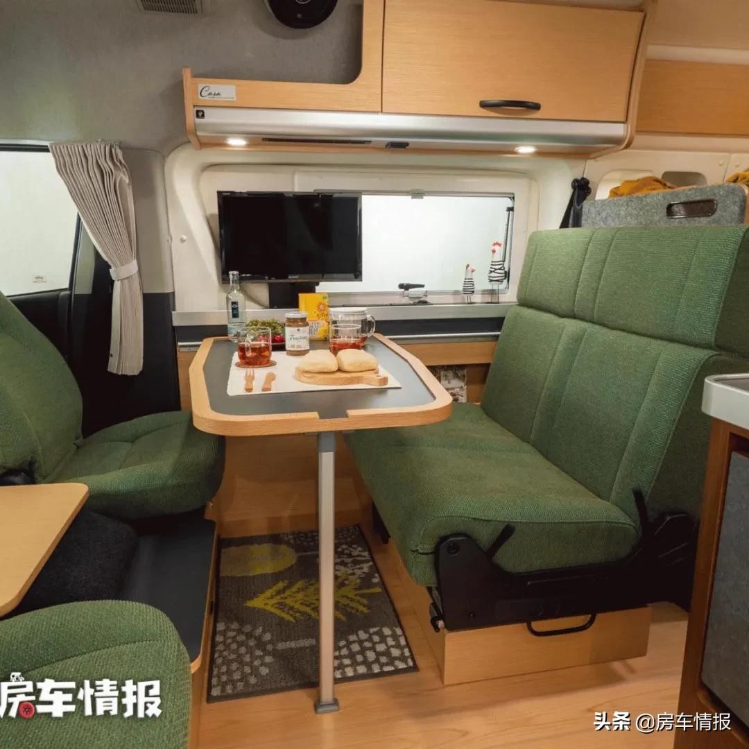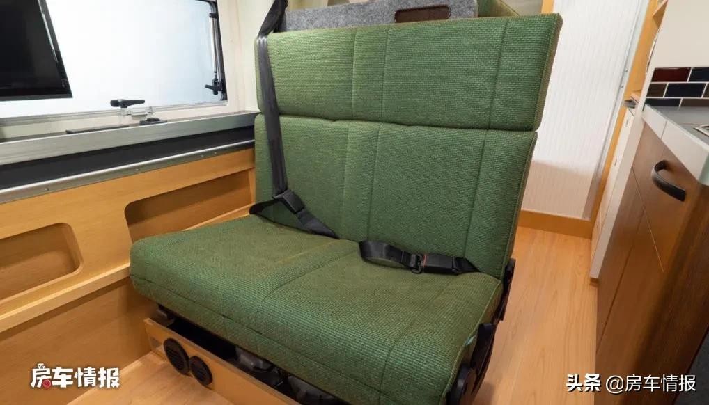 为了弥补前方会客区的空间不足,驻车以后可以把主副驾驶座椅向后旋转,与后方的双人座椅形成一个对坐的形式。值得注意的是座椅的面料均采用的是阻燃材料,避免烟头等烫坏,更易于打理,同时在乘坐舒适性上也要比国内同类型房车所使用的皮革更优。