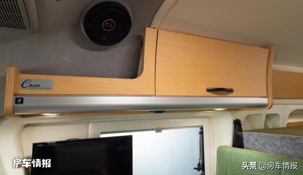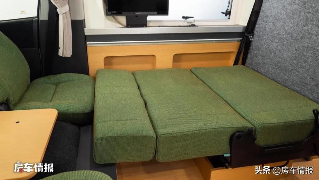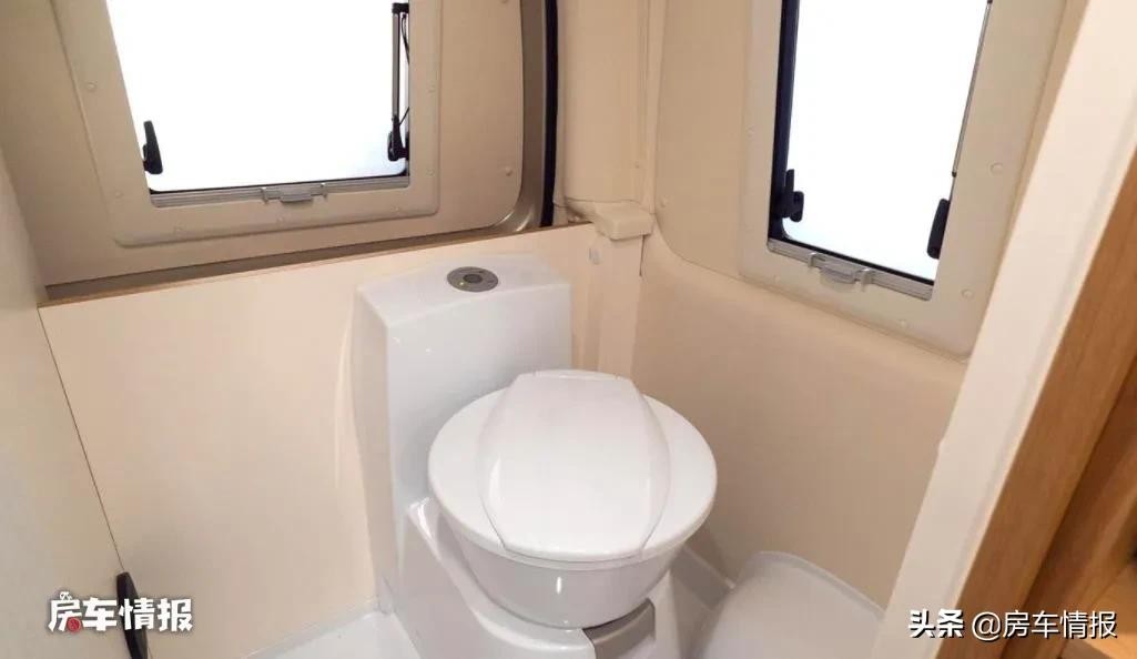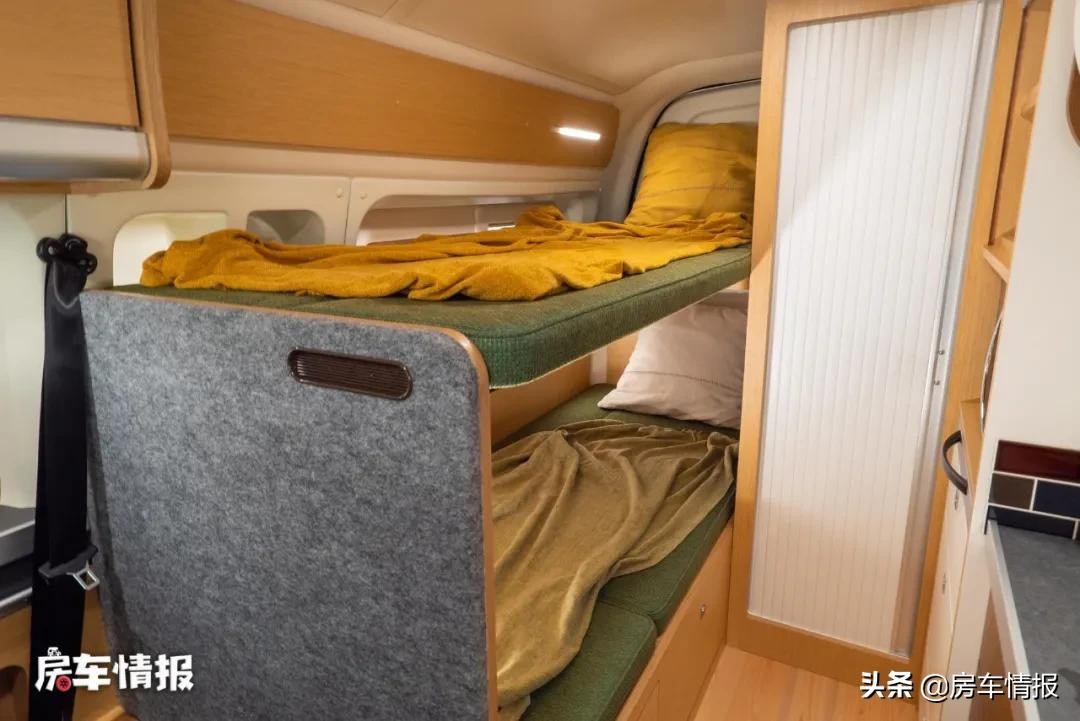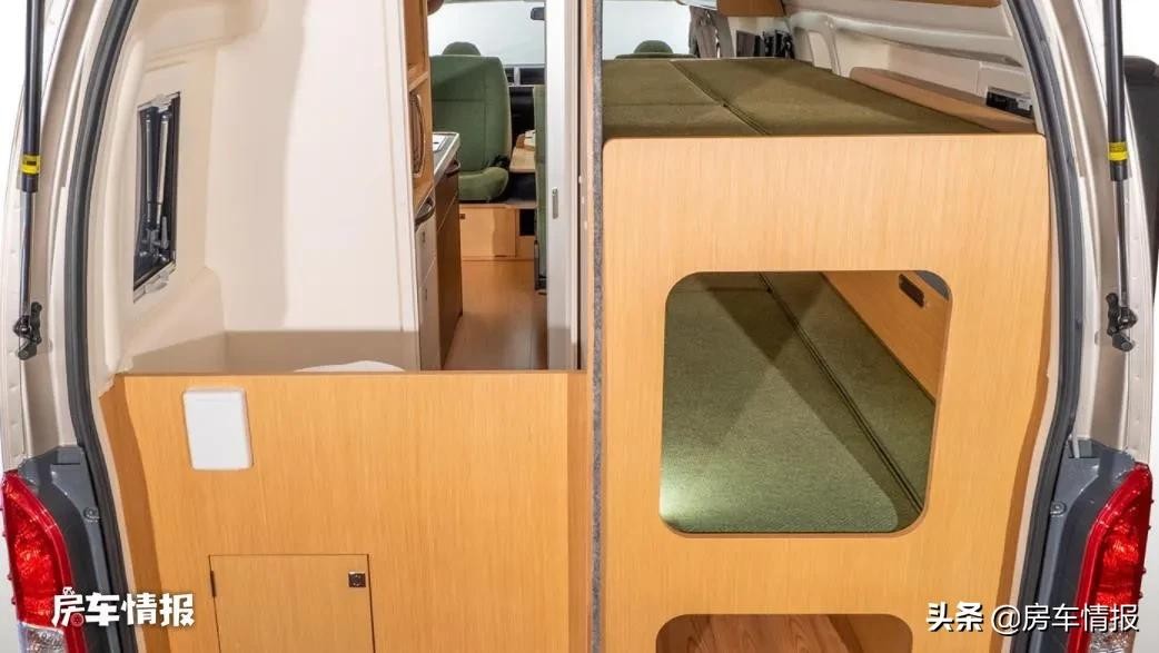 来到车厢后方,和那些采用简易拼床的海狮房车不同,这款车则是提供了固定床位和独立卫生间,这点在同类型房车上挺少见,如此就和真正的房车没有差别了。