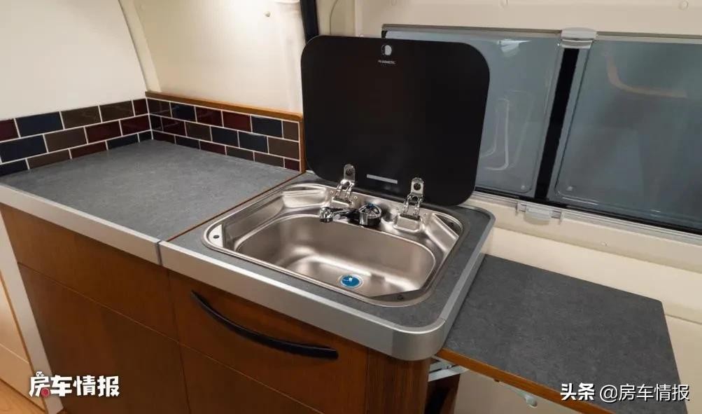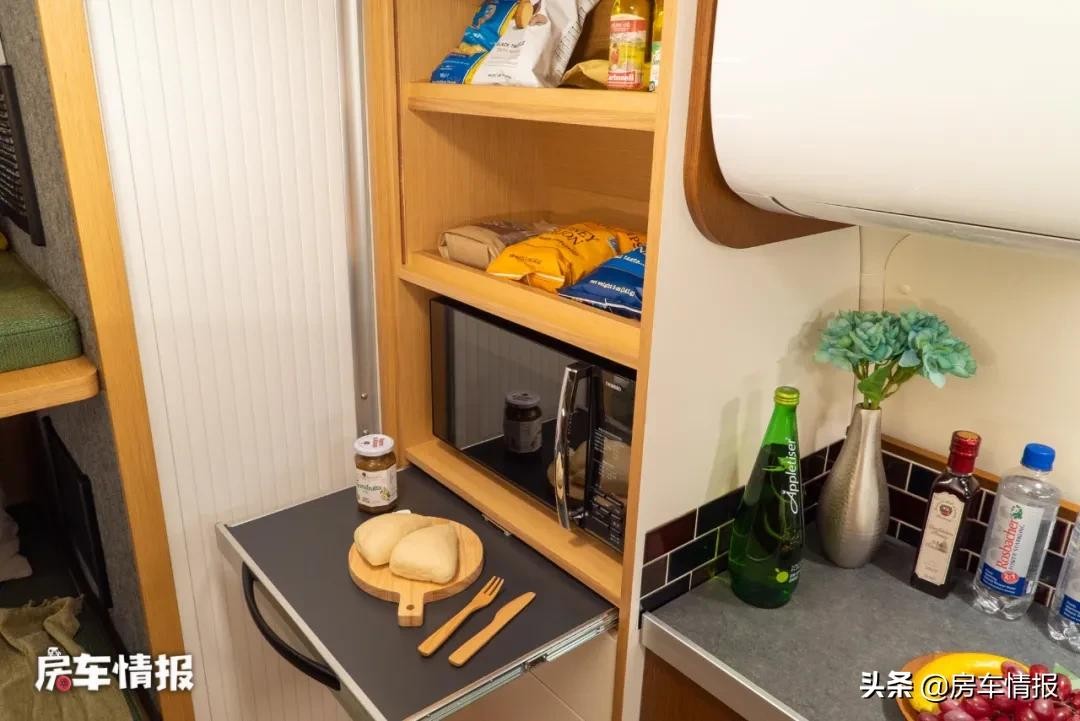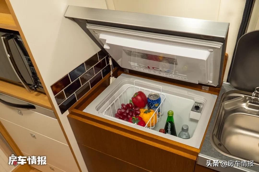 位于车厢侧滑门旁还设置了一组橱柜,整个橱柜的尺寸在日系房车里算是比较大的,功能也挺齐全,提供了洗菜池、50L冰箱、微波炉、储物柜等,如果想要做饭的话还是需要自备卡式炉。