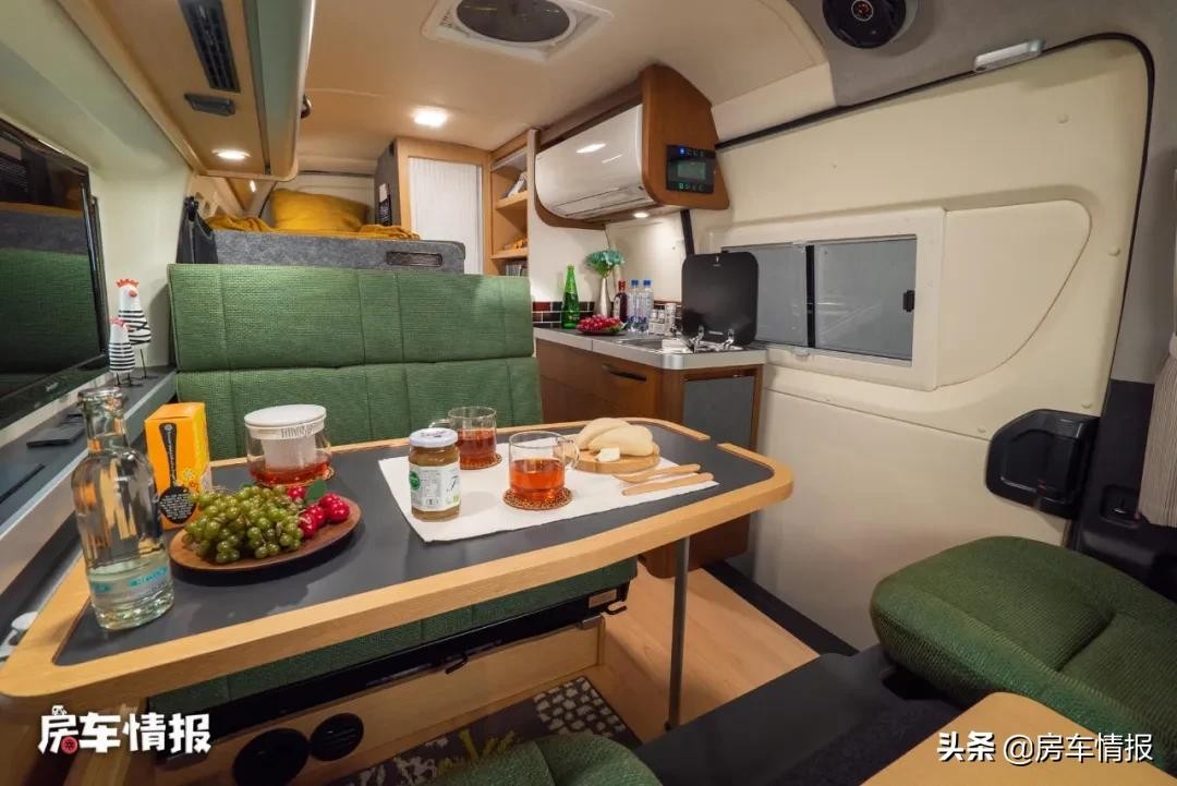 进入车厢内部才是这辆车最为巧妙的地方,不同于常见的那些为了追求商务需求而简化居家功能的车型,这款车的内部设计就是一辆标准的房车,既有会客休息区,也有厨房卫生间区域,同时还带有固定床位休息区。