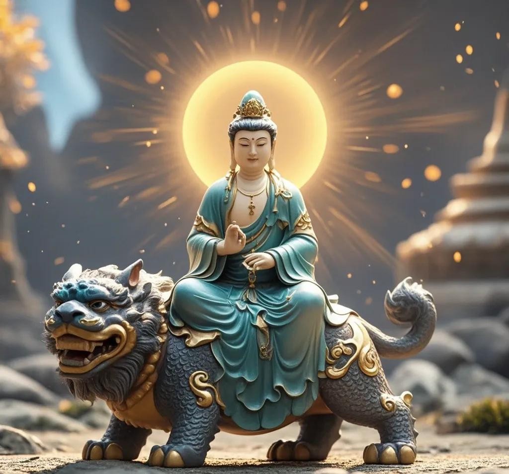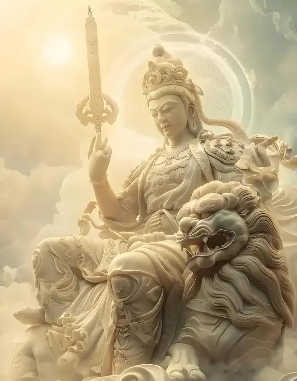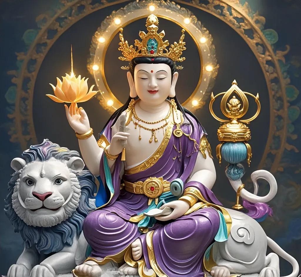 再来讲讲文殊菩萨,他是文殊师利的简称,意为妙法妙吉祥。传说文殊菩萨出生之时相貌庄严,具三十二种法相。成道之后,文殊菩萨在佛陀的弟子中位居上首,在众菩萨当中堪称第一。文殊菩萨身体呈紫色,形如童子,右手持金刚般若智慧之力,能够斩妖除魔,阻断一切烦恼;左手持莲花,花上有金刚般若金宝卷,象征着无上光辉。其坐骑是一只狮子,暗示着智能威猛。