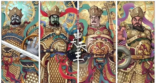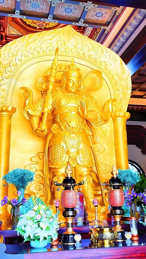 而护法呢,我们熟知的有四大天王和韦陀菩萨,他们都属于护法。通常,这五位都在一个殿内。寺庙也有一些不成文的规矩,可根据韦陀菩萨手持降魔杵的姿态和形态来判断能否接待远游的行脚僧。四大天王无论是在民间神话还是经中记载都非常详细,四大天王的法器也被谐音成了极具中国特色的四个字——风调雨顺。
