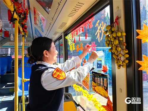 10月30日上午,以秋日颜色为装扮的228路主题车正式投入运营。步入车厢,首先映入眼帘的是玻璃上金黄的银杏叶和鲜艳的红枫叶,银杏叶装饰成“2024”的图案,枫叶则围绕在中山公园、八大关攻略的海报周围,整个车厢宛如一座秋日的花园。“我们在栏杆上缠绕着仿真藤蔓与秋叶,并用丰收的果实装饰其间,希望乘客上车后能感受秋天的浪漫与温暖。”市南巴士228路驾驶员刘法珍介绍,车厢内还点缀着“渐寒 添衣 安好”的温馨提示,让乘客在享受美景的同时,也能感受到来自青岛巴士的关怀与温暖。