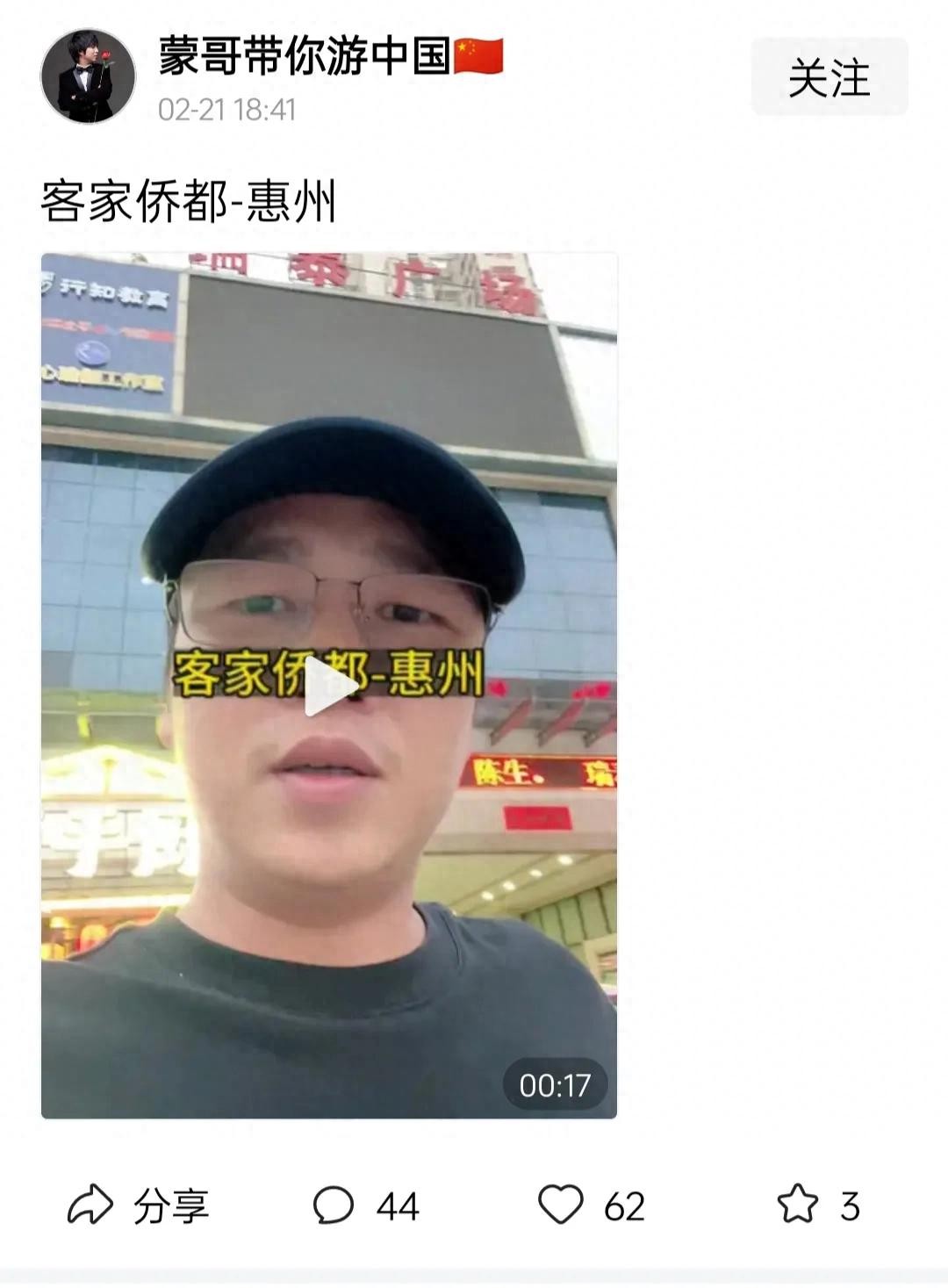图片这个人做了个视频,标题是“客家侨都-惠州”,然后在视频里大声说大部分惠州人都不认为自己是客家人,言下之意想说惠州没有或很少客家人,有也可忽略不计,对惠州是客家侨都暗示了不满。据说这个人不是广东人,而惠州作为广东GDP第五的城市,他对惠州好像挺有兴趣的。