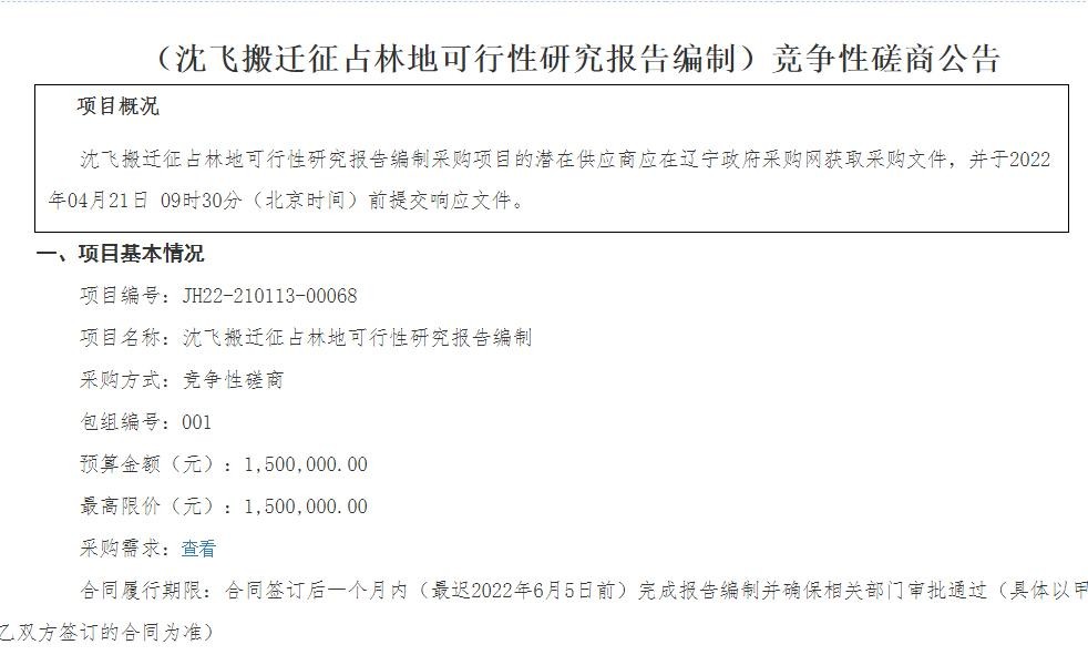 根据最新的关于沈飞搬迁相关招标公告显示,项目名称为《沈飞搬迁征占林地可行性研究报告编制》,采购方式为竞争性磋商,预算与最高限价均为150万。合同签订后一个月内(最迟2022年6月5日前)完成报告编制并确保相关部门审批通过(具体以甲乙双方签订的合同为准)。