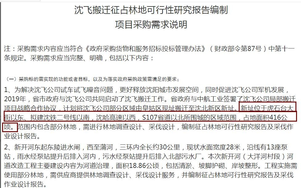 根据招标公告的采购需求显示,为解决沈飞公司试车试飞噪音问题,更好释放沈阳城市发展空间,同时促进沈飞公司军机发展,2019年,省市政府与沈飞公司共同启动了沈飞搬迁工作。省政府与中航工业签署了沈飞公司局部搬迁项目战略合作协议,计划将沈飞公司部分区域由皇姑区现址搬迁至沈北新区新址。新址位于虎石台大街以东、拟建沈铁二号线以南,沈哈高速以西,S107省道以北所围成的区域范围,占地面积416公顷。
