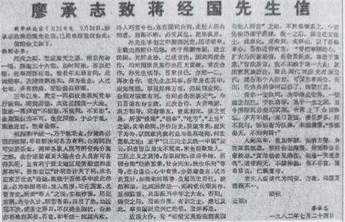 1982年7月24日,廖承志亲自致信蒋经国希望国共两党同捐前嫌,共创祖国统一大业。信中说,祖国和平统一乃千秋伟业,台湾早日加紧回归祖国,早日解决对各方有利。