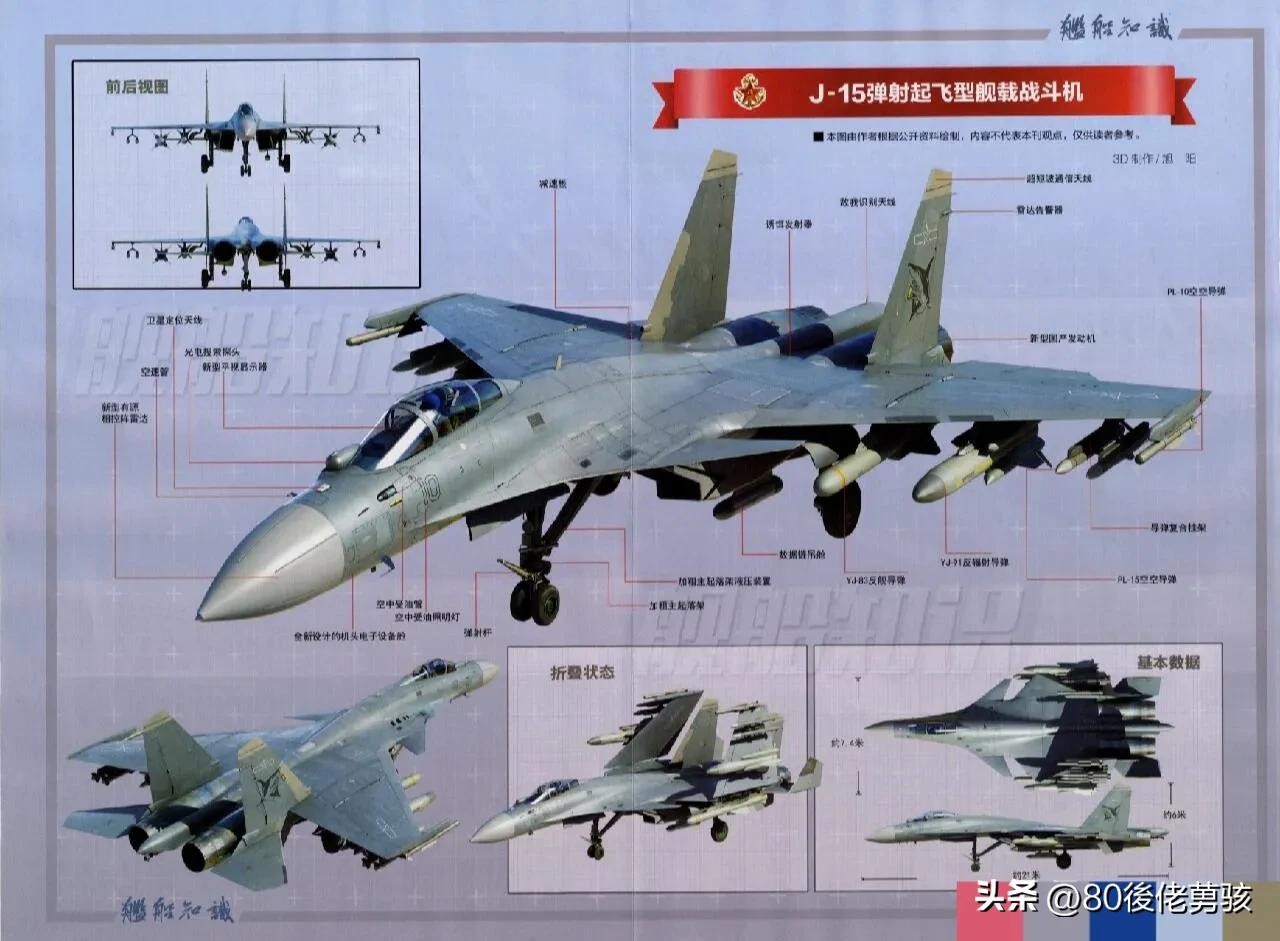 歼15舰载战斗机绰号“飞鲨”,北约代号“侧位D型,其长度为22.28米,翼展15.0米,高度5.92米,空重17500千克,正常起飞重量27000千克,最大起飞重量32500千克,安装2台WS-10加力涡扇发动机,推重比为0.97,最大速度为2.4马赫,最大航程为为3500公里,最大实用生限20000米。