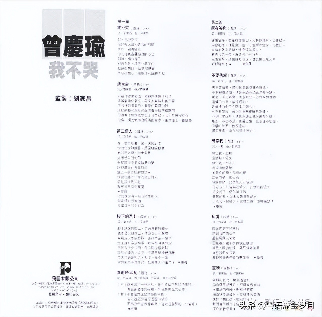在 1985 年,曾庆瑜推出了《我不哭》专辑。在这张专辑中,令人瞩目的是,其中仅仅收录了三首粤语歌曲。这三首粤语歌曲分别是《还在等你》、《不要落泪》以及《毋忘我》。它们各具特色,以独特的旋律和深情的歌词展现出粤语歌曲的独特魅力。