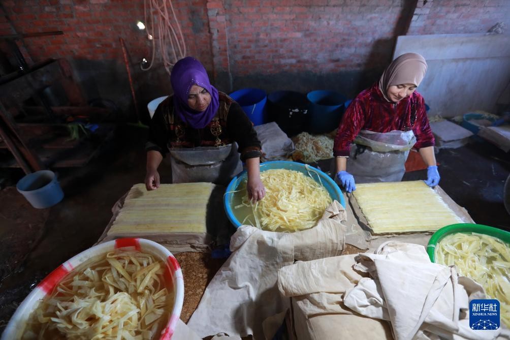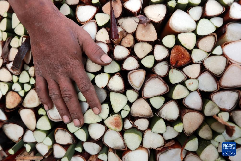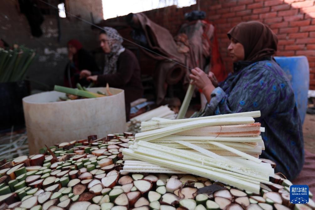 1月16日,在埃及东部省卡拉姆斯村村民赛义德的纸莎草纸制作作坊,村民将纸莎草茎秆切割成薄片。