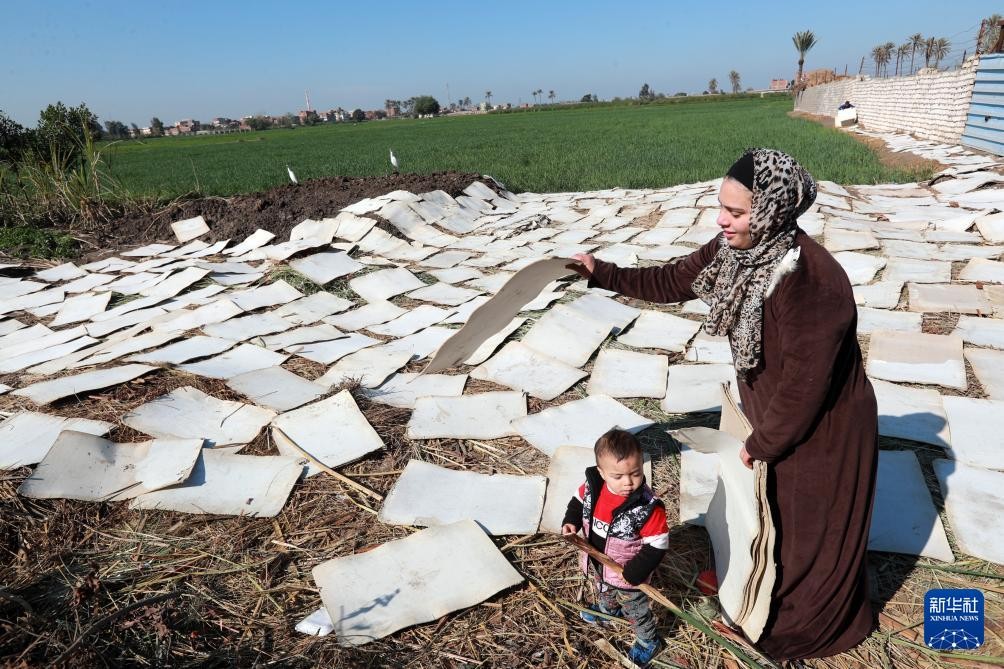 1月16日,在埃及东部省卡拉姆斯村村民赛义德的纸莎草纸制作作坊,村民晾晒在纸莎草纸制作中用到的纸板。