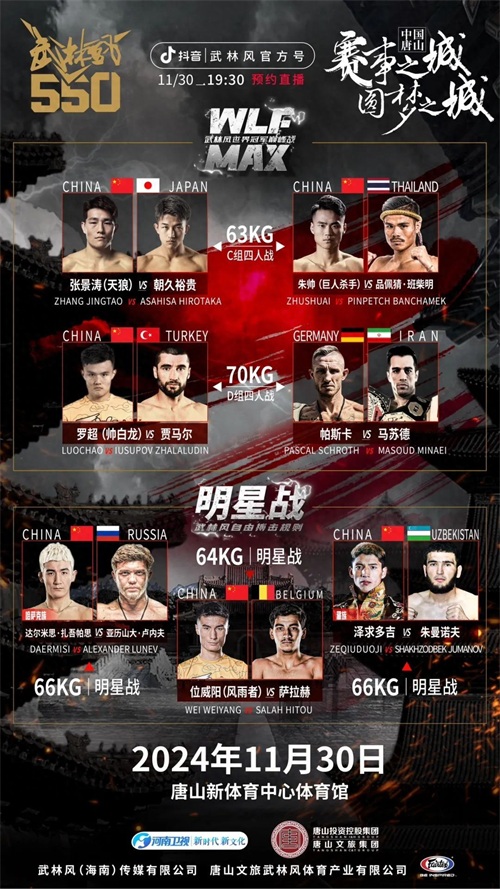 11月30日19 :30,武林风550的比赛将在抖音“武林风官方”进行付费直播!