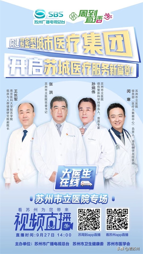 今天(9月27日),由苏州广播电视总台、苏州市卫生健康委员会、苏州市医学会联合打造的权威名医互动直播《大医生在线》,集结了苏州市立医院的权威大咖,聊聊医院建设与发展的那些事。