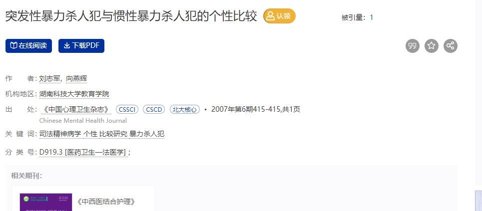 参考资料:[1]刘志军,向燕辉.突发性暴力杀人犯与惯性暴力杀人犯的个性比较[J].中国心理卫生杂志,2007,21(6):415-415
