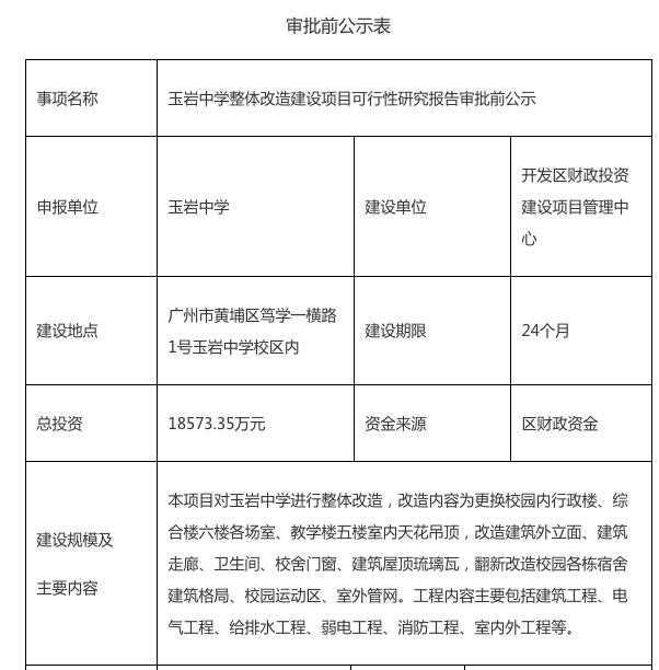 近日,广州黄埔区官网挂出《玉岩中学整体改造建设项目可行性研究报告审批前公示》。根据公示内容,玉岩中学整体改造建设项目总投资18573.35万元。