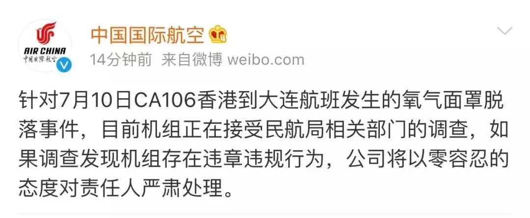 7月10日,由香港国际机场飞往大连周水子机场的国航CA106航班,在飞行过程中发生紧急下降,并释放了旅客氧气面罩。该航班于北京时间22时31分在大连机场安全落地,机上153名旅客、9名机组成员无人员受伤,飞机没有受损。