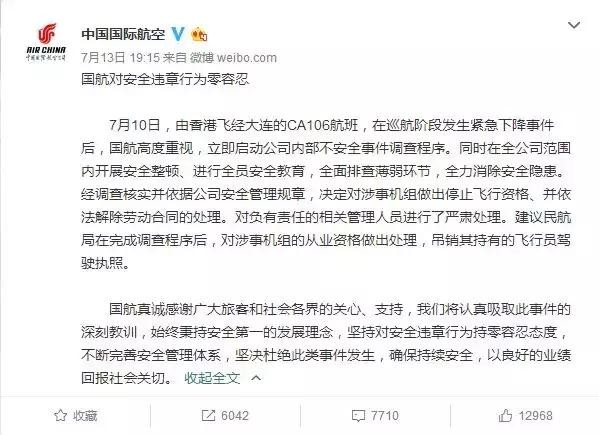 昨晚7时许,国航发布消息称,经调查核实并依据公司安全管理规章,决定对涉事机组做出停止飞行资格、并依法解除劳动合同的处理。对负有责任的相关管理人员进行了严肃处理。建议民航局在完成调查程序后,对涉事机组的从业资格做出处理,吊销其持有的飞行员驾驶执照。