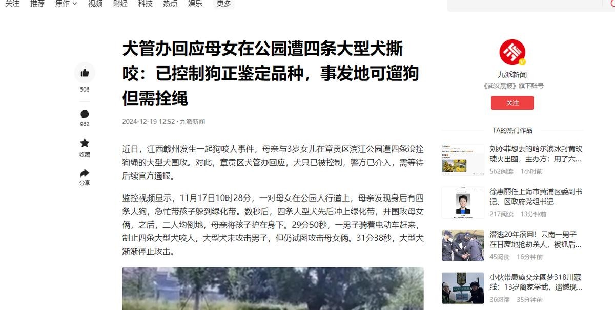 【2】九派新闻,2024-12-19,“犬管办回应母女在公园遭四条大型犬撕咬:已控制狗正鉴定品种,事发地可遛狗但需拴绳”.