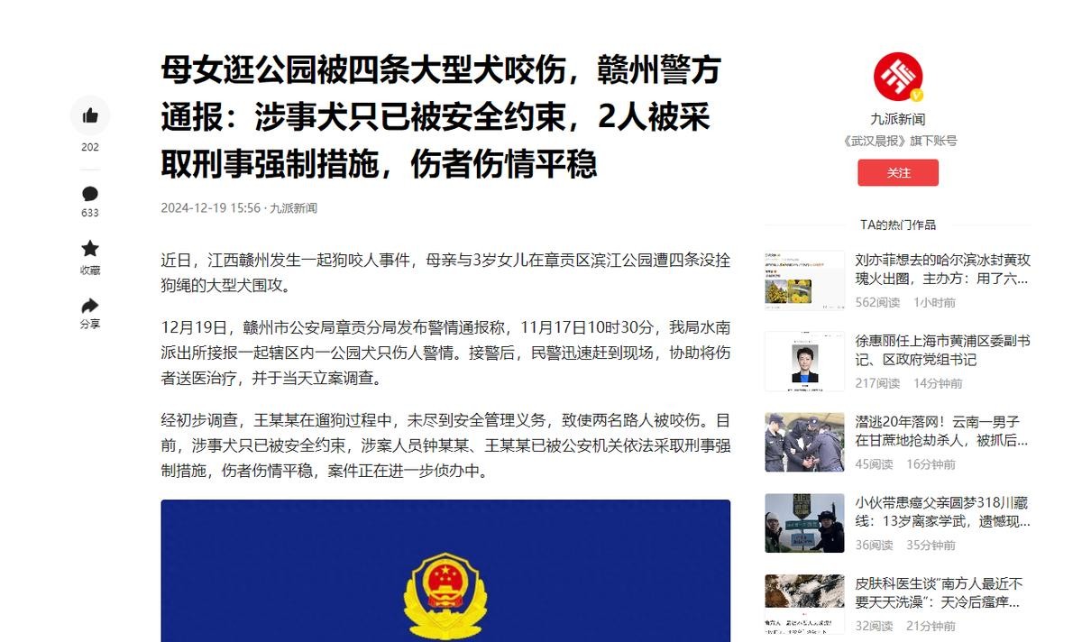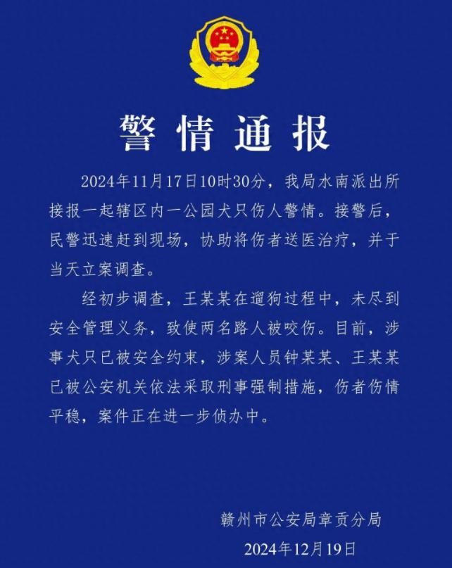 【1】九派新闻,2024-12-19,“母女逛公园被四条大型犬咬伤,赣州警方通报:涉事犬只已被安全约束,2人被采取刑事强制措施,伤者伤情平稳”.