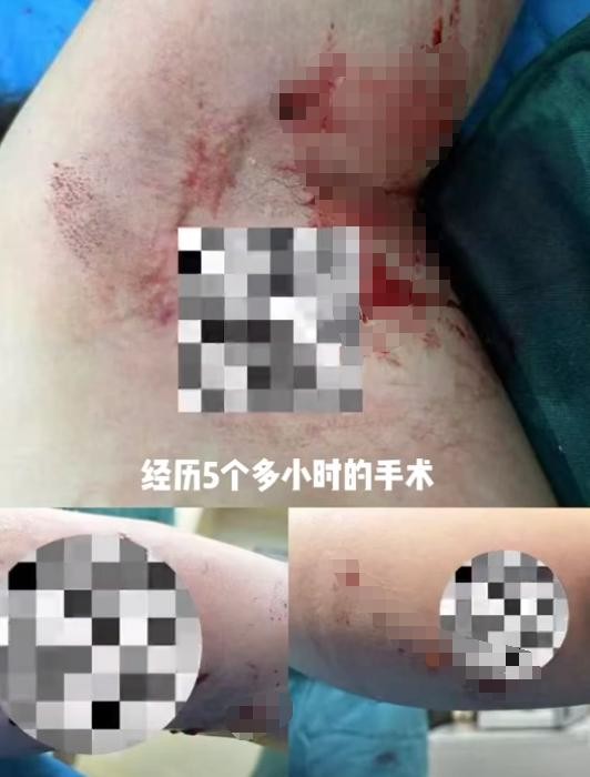 全身上下十几处伤口,最大的一处在大腿上,生生被扯掉一块肉,伤口里面甚至能伸进去一只小孩的拳头,连韧带都被咬断了,疼痛程度超乎想象。