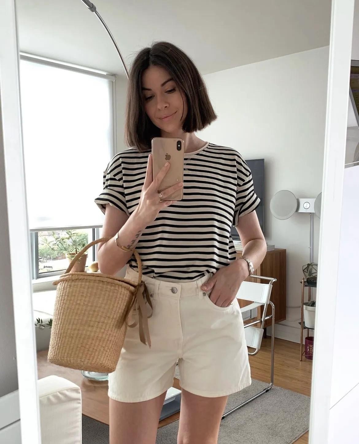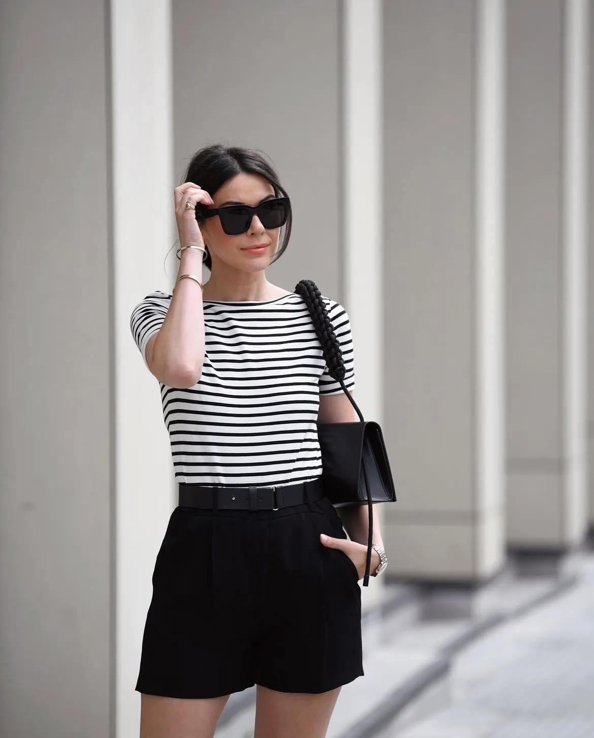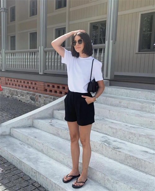 如果你跟我一样是梨形女生大腿偏粗壮,就必须选廓形的黑色短裤啦。腿部留出空间不会太紧绷,继续用百搭款黑白细纹T恤呼应,轻松穿出日常时尚感。