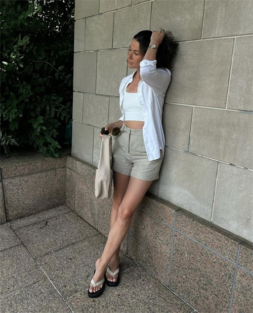 还可以增加别致带女人味,斜肩几何感的剪裁,让背心也能成为勾勒迷人线条的单品,再用白色西装短裤提亮,穿舒服的人字凉拖,短裤搭配又完成一身漂亮穿搭啦。