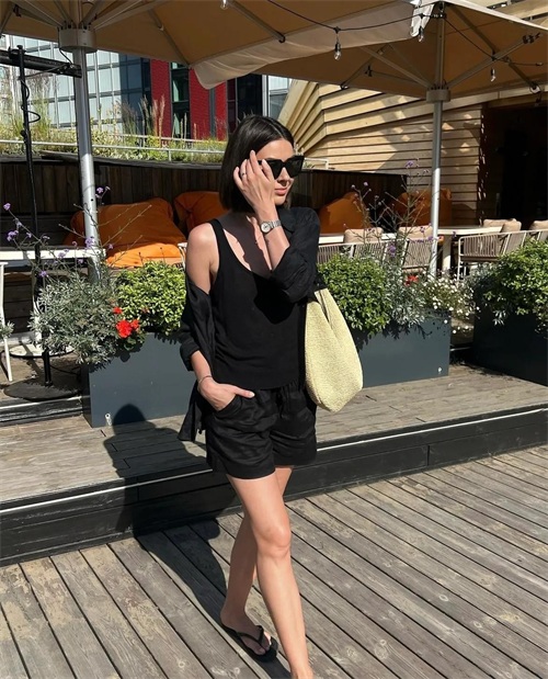 周末放假时,则用简单的黑色背心搭同色短裤,再外搭一件微宽松的衬衣,一身黑衣也能穿得自在自然。