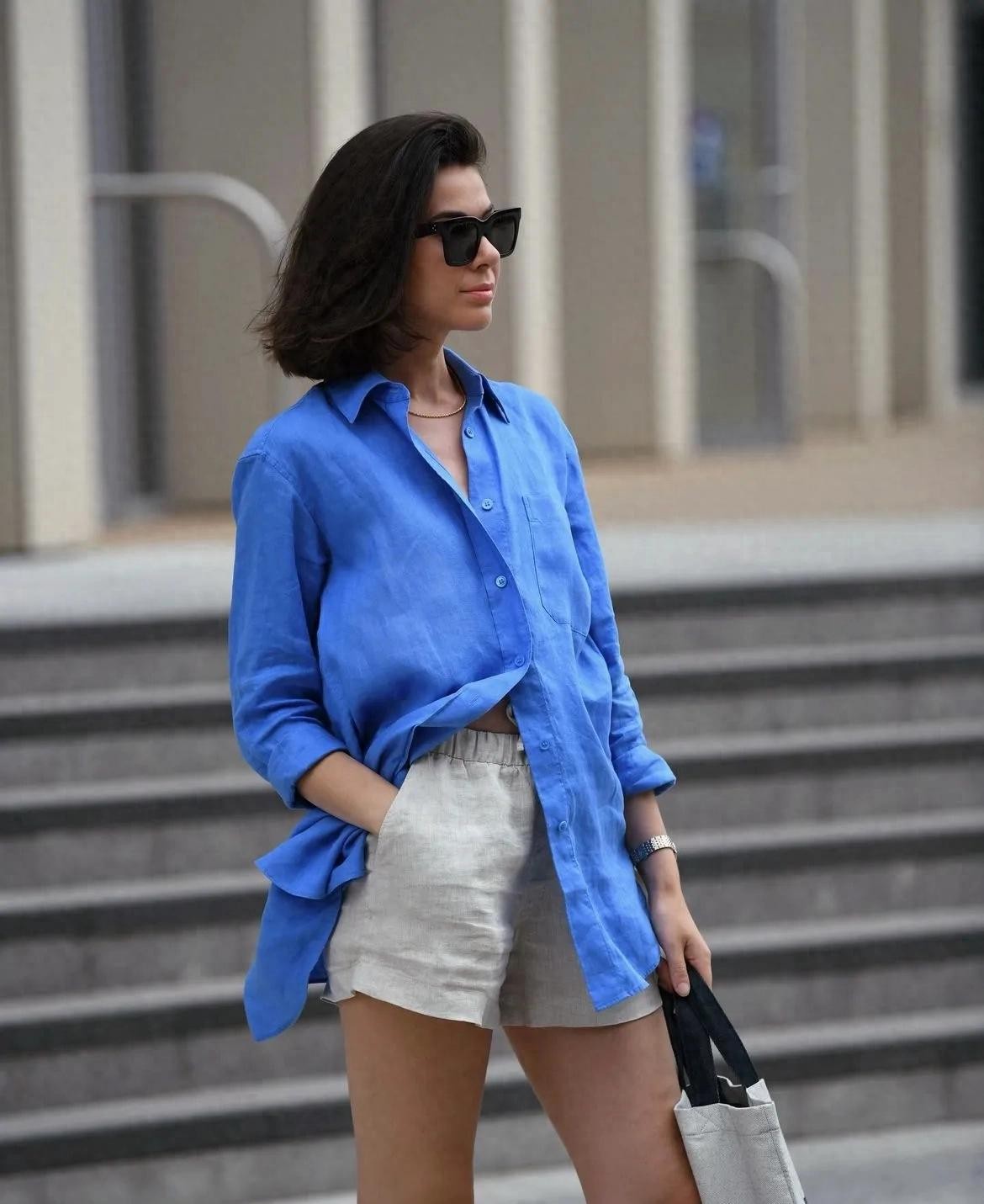 棉麻面料会让蔚蓝衬衫更轻柔飘扬,也有柔软细腻的感觉,搭配同样面料的短裤,是今年正流行的慵懒自在风。