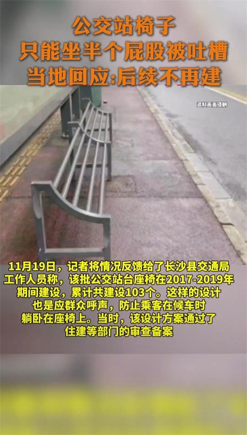 国外有些地方的公共设施设计就人性化多了,比如岛国那边的多功能座椅,可以根据使用者的需求来调整。长沙县的公交座椅一共103个,2017到2019年建的,深圳那边的事件在媒体报道后迅速得到回应,效率杠杠的。