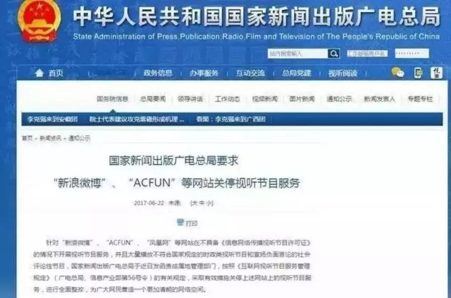 2017年6月,A站又因不具备《信息网络传播视听节目许可证》,被国家广电总局关停了视听节目服务。