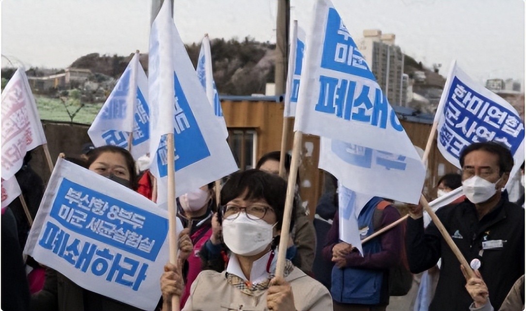 当时,韩国民众聚集在釜山港第八码头美军基地外,手中高举标语抗议,“凭什么美国要在韩国搞实验,美国是呆不下去了,非要来韩国?”