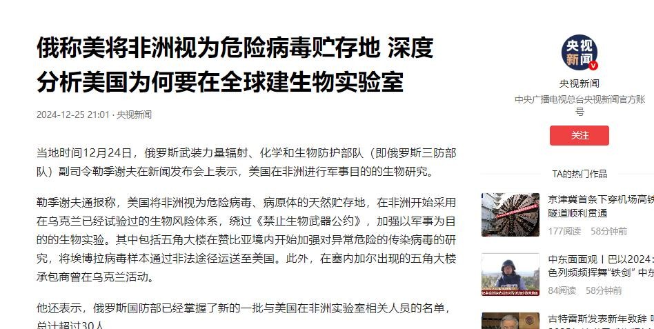12月24日,俄三防部队副司令勒季谢夫公开宣称,美国正在非洲开展具有军事目的的生物研究,且严重质疑美国此举意在限制所有国家。