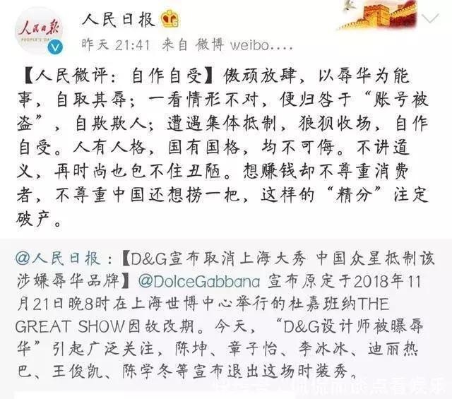 今天是D&G取消上海大秀的第48个小时,不得不说的是,我们在这件事上终于见到了难得的中国的脊梁。24位东方模特联名罢演,迫使主办方杜嘉班纳取消了原定的服装秀,创始人出面道歉,在网站上搜索相关词汇,会看到一条置顶的提示:“中国向来对外企友善,但绝不代表没有底线。有尊重才有买卖。中国,才是我们最珍视的奢侈品。转自《人民日报》”。