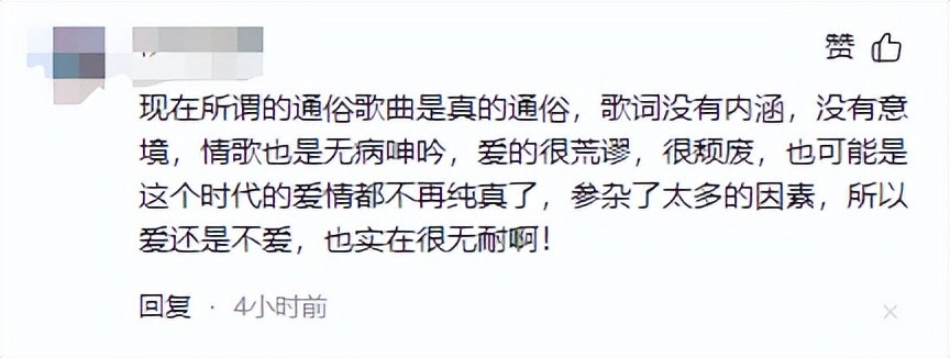 这就是现在这些口语歌的现状,网友们的愤怒和失望溢于言表,他们怀念你那个诸神争霸、佳作频出的年代,怀念那些能够触动心灵的歌曲。