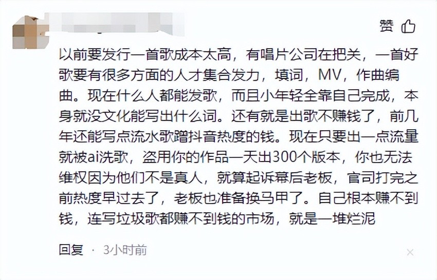 更有甚者,直接将矛头指向了音乐平台:“平台为了流量不择手段,什么歌火就推什么歌,完全不顾及音乐的质量。”