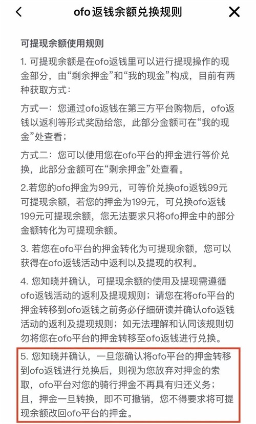 记者关注到,在“ofo返钱余额兑换规则”中明确提出,“一旦您确认将ofo平台的押金转移到ofo返钱进行兑换后,则视为您放弃对押金的索取,ofo平台对您的骑行押金不再具有归还义务”;且押金一旦转换,不可撤销,用户无法要求将提现余额改回ofo平台的押金。