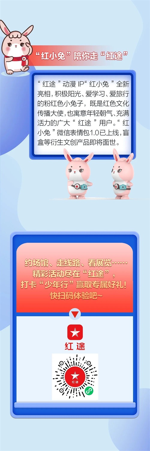 “红途”动漫IP“红小兔”全新亮相,进一步提升品牌的亲和力与吸引力。这只粉红色小兔子,名称取“红途”谐音,积极阳光、爱学习、爱旅行,既是红色文化传播大使,也寓意年轻朝气、充满活力的广大“红途”用户。