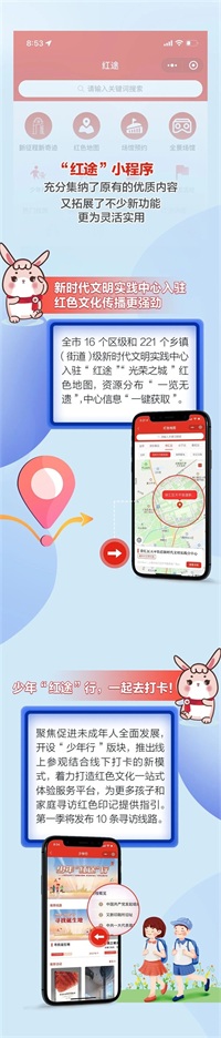 上海全市237个新时代文明实践中心入驻,全新“少年行”板块、数字全景场馆专区、一站式预约平台和动漫形象IP“红小兔”上线……“红途”小程序资源展示更丰富、内容推介更智能、功能应用更亲民,将大幅提升红色文化对年轻用户的吸引力,在满足学习、体验、社交等需求的基础上,更具快速传播和集聚粉丝的能力。