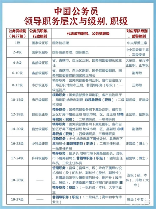 公务员职务职级体系是我国政治体制中的重要组成部分,它对于明确公务员职责、规范公务员管理、提升行政效能具有重要意义。下面,我们将详细阐述我国公务员职务职级体系的划分情况。
