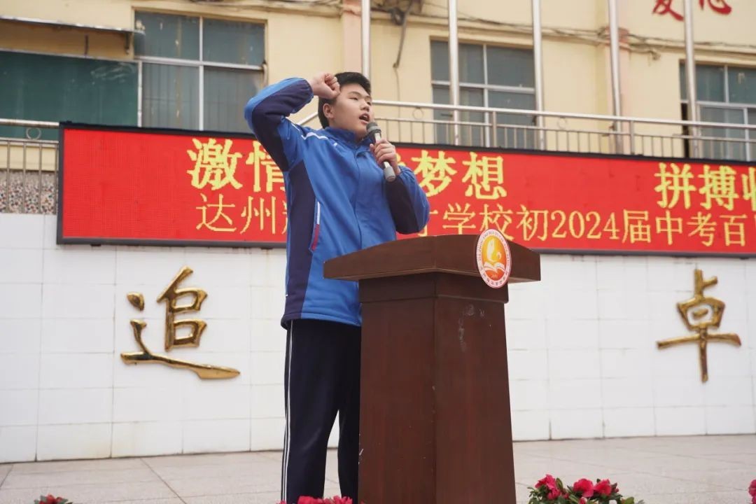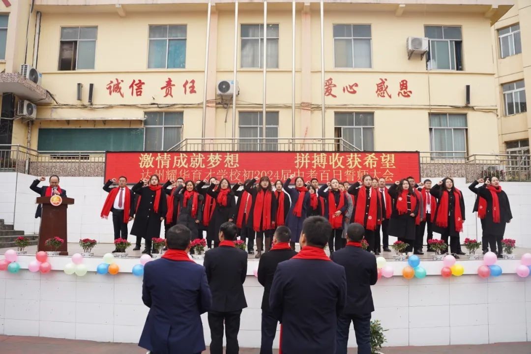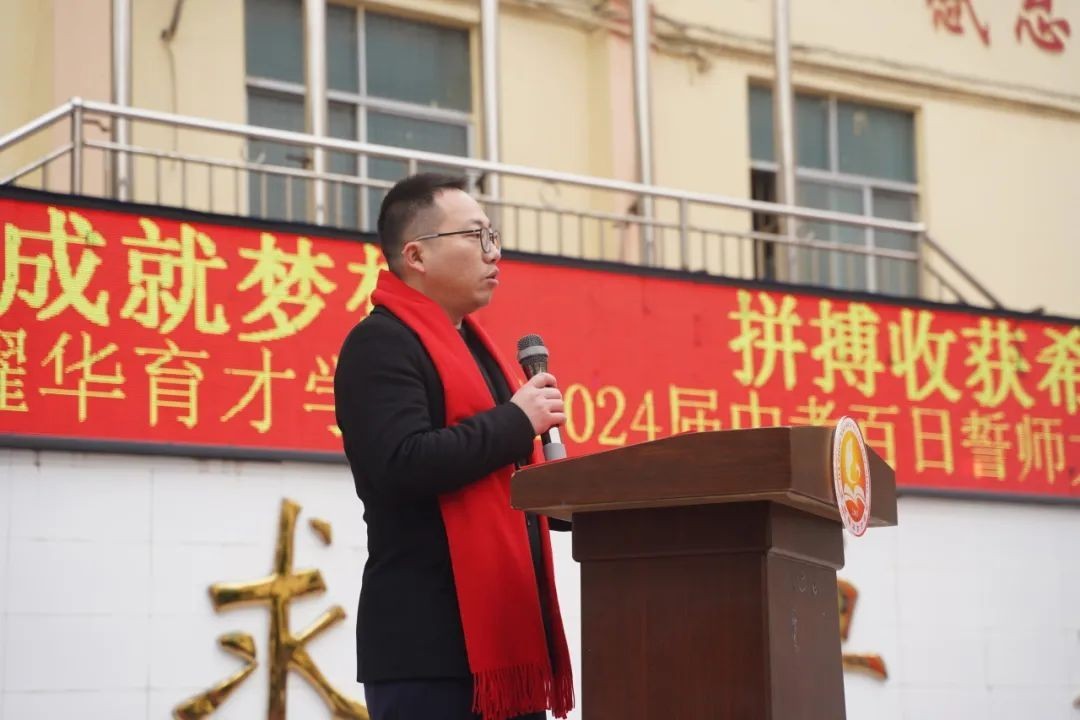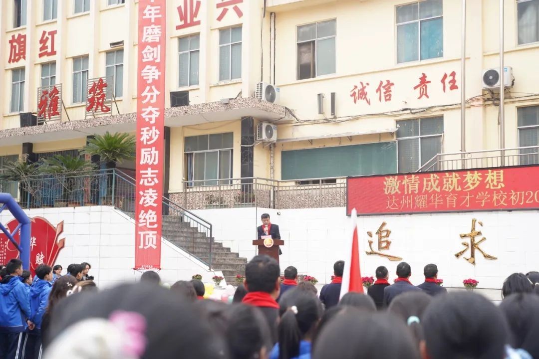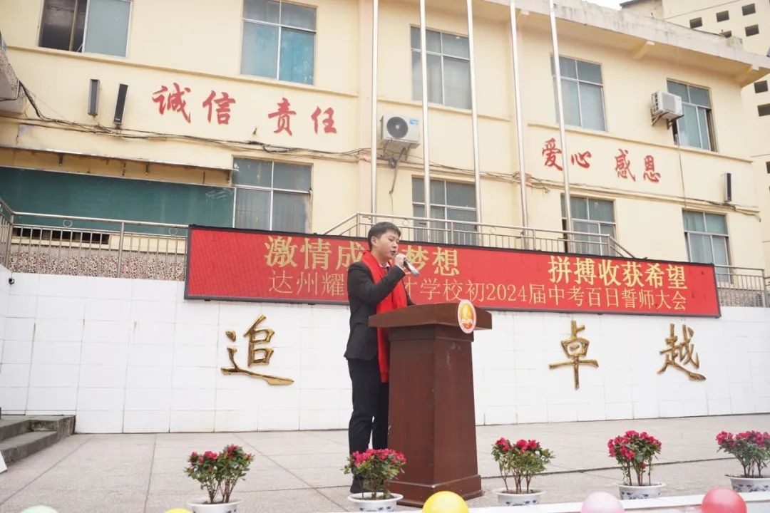 大家好! 冰雪消融,化作千顷碧波;书声琅琅,铺就锦绣前程。在这个特殊的日子里,我们齐集一堂,共同见证一个重要而庄严的时刻——百日誓师。首先,我代表达州市高新区耀华育才学校董事会,向辛勤耕耘的老师们表示衷心的感谢,向孜孜以求的同学们表示亲切的慰问。