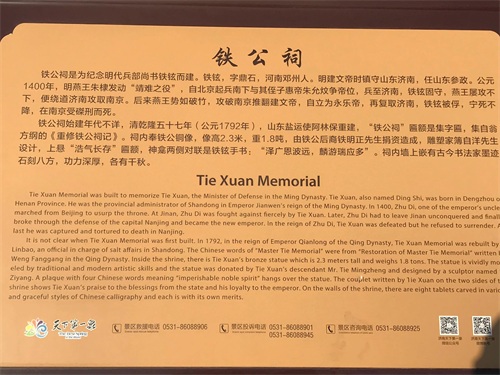 铁铉(1366—1402),1400年,时任山东参政,镇守济南。抵抗燕王朱棣,至燕军不得入济南城,保得济南免于战火,后收复失地,晋兵部尚书。1402年,朱棣即位登基,设伏兵计擒铁铉,槛送南京。铉公面朱棣威武不屈,终受磔刑而死,年三十七岁。