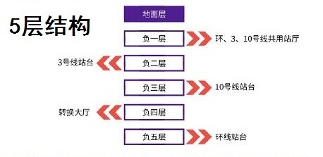 负一层:三条线路共用的站厅负二层:重庆轻轨3号线的站台负三层:重庆地铁10号线的站台负四层:换乘大厅负五层:重庆地铁环线的站台
