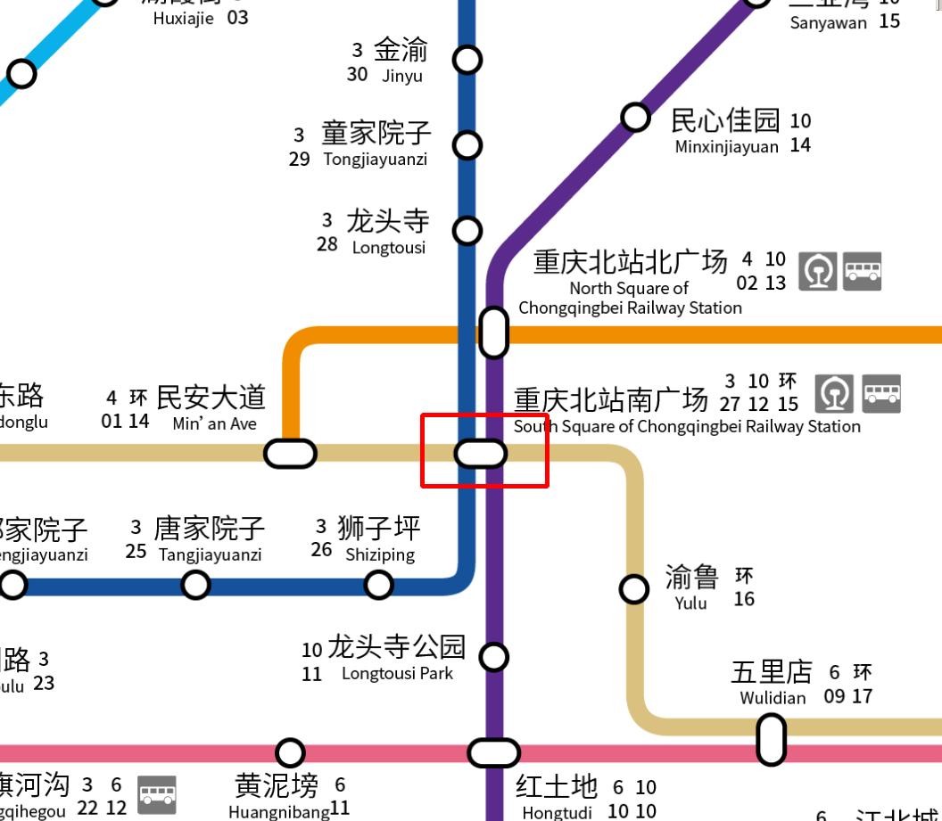 虽然重庆北站的南广场的交通还有一些瑕疵,但是重庆轻轨3号线、重庆地铁10号线、重庆地铁环线三条线路在此处的换乘,还是非常方便的,这也得益于重庆北站南广场的五层结构。